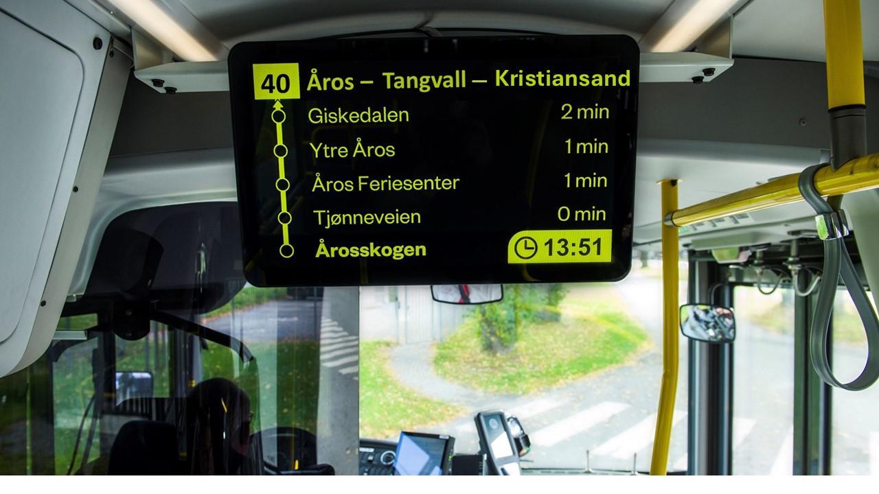 - Alle busser er utstyrt med innvendige skjermer (noen busser har enklere Led-skjermer med begrenset informasjon) som viser de neste holdeplassene, og hvor mange minutter det beregnes for å komme dit.